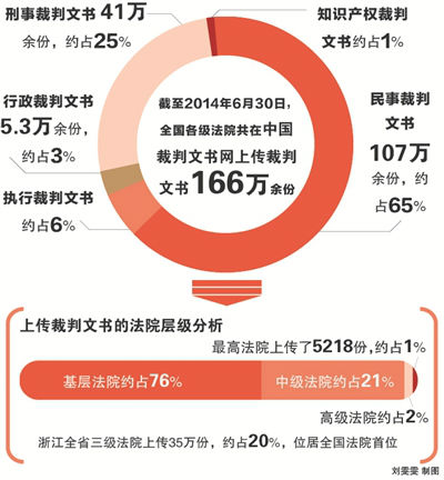 从上传裁判文书的法院层级分析,最高法院上传了5218份,约占1%;高级法院约占2%;中级法院约占21%;基层法院约占76%。而浙江全省三级法院上传35万份,约占20%,位居全国法院首位。